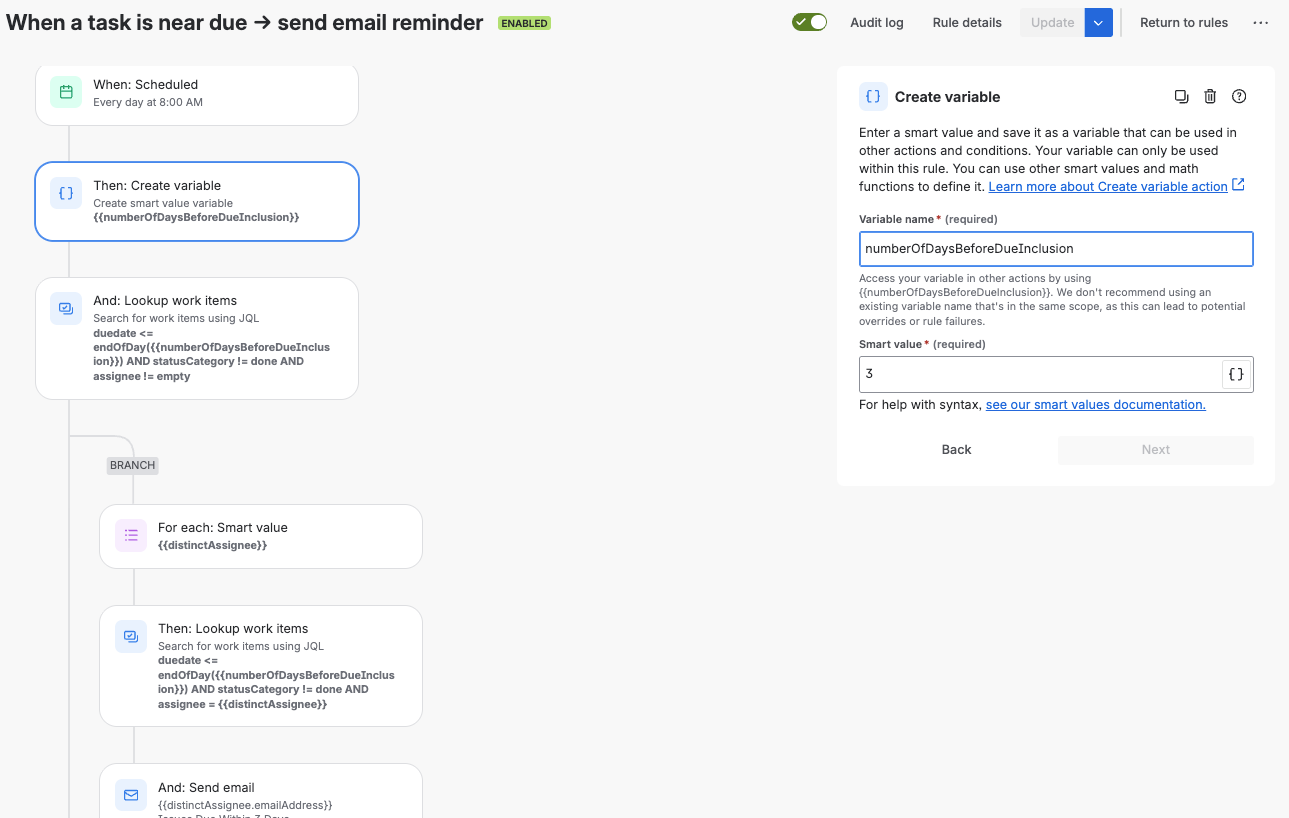 Example variable and smart value to enable email reminder
