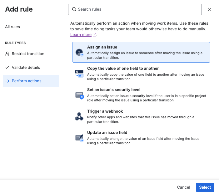 Transition actions or Perform action rules (formerly Post-functions) sit inside Jira workflows and automate tasks when a work item changes status.